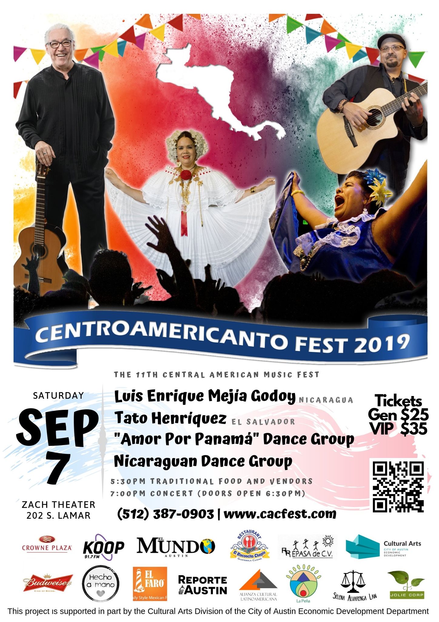 The 11th edition of Centroamericanto Fest will feature the legendary singer-songwriter Luis Enrique Mejía Godoy accompanied by the talented Manuel Guadamuz on guitar and Edwin Rayo on keyboard. Tato Henríquez from El Salvador, Amor por Panamá folkloric dance, Nicaraguan dances, local Central American artists and Central American food. Food and vendors start at 5:30 PM. Concert doors open at 6:30 PM